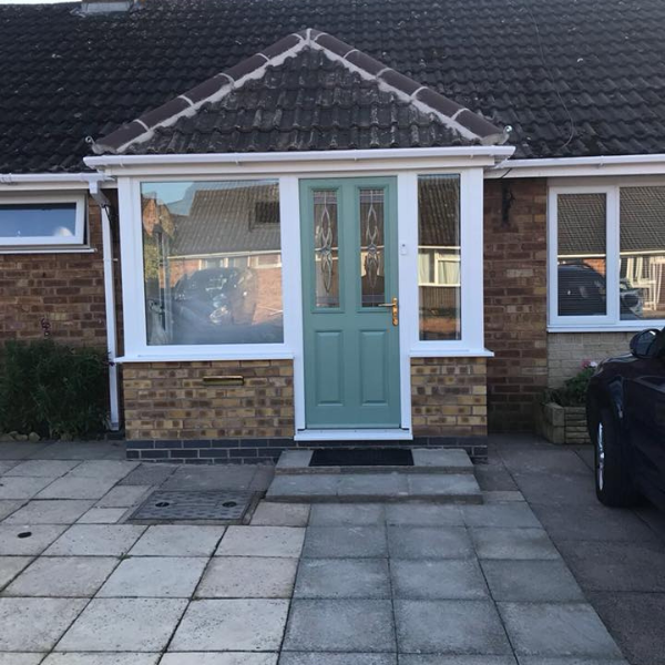 The front door ties everything together. The woodgrain finish keeps the look cohesive, while the stained glass panel adds a decorative focal point as you approach the property. It lets light into the hallway but still offers privacy, which works particularly well on a bungalow where the entrance is more visible from the garden.