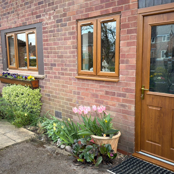 The oak effect uPVC casement windows give a warmer, more traditional feel than standard white, sitting comfortably against the brickwork and soft landscaping. They offer the look of timber without the upkeep, so the finish stays consistent without the need for regular painting or treatment.