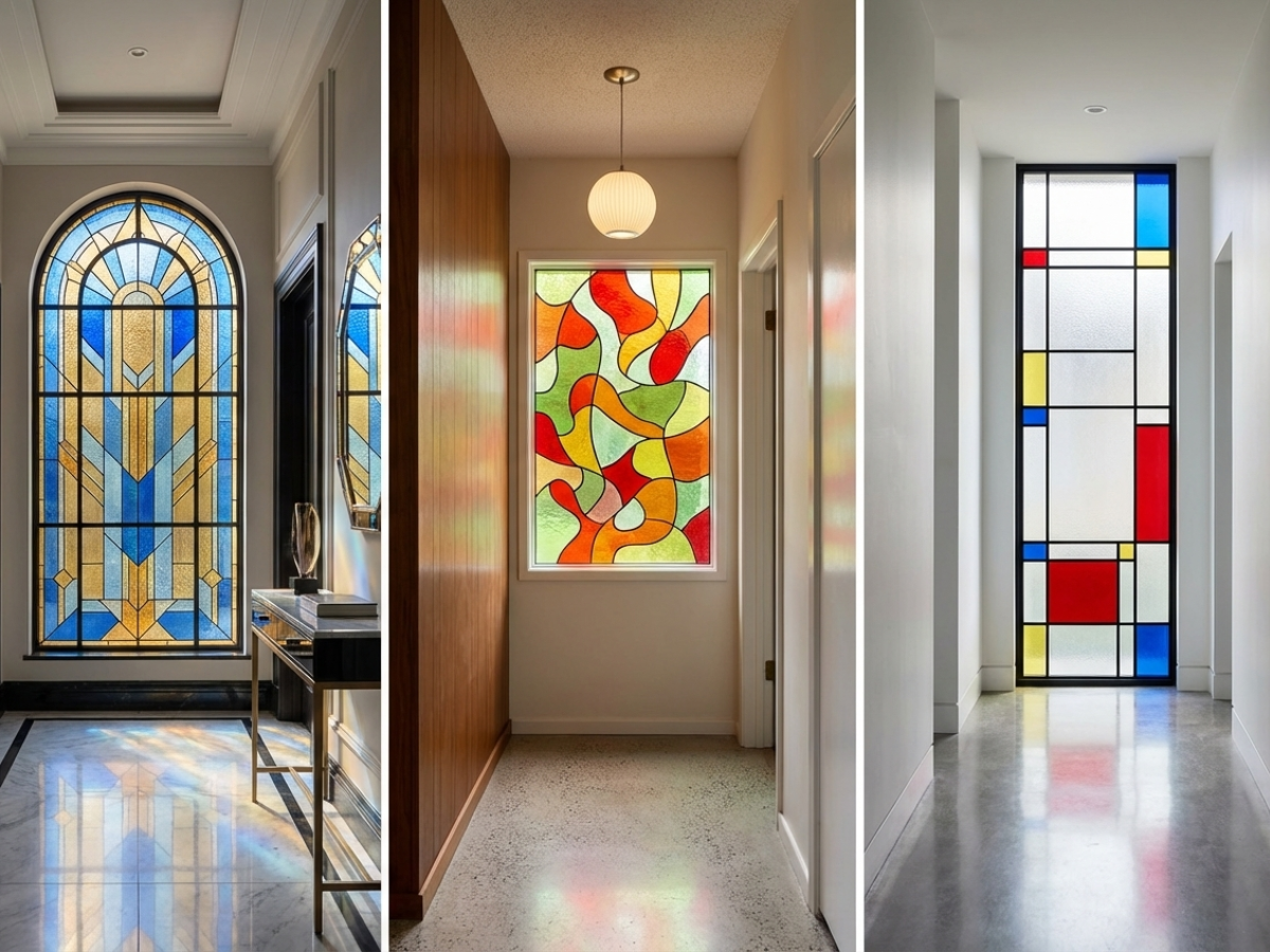 It is most effective in entrance areas such as front doors and top lights, where it creates an immediate impression from both inside and out. Hallways and staircases are also ideal, as stained glass can brighten what are often darker transition spaces. Bathrooms benefit from the added privacy, while still allowing daylight to filter through.
